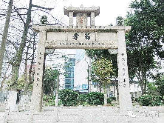 土白节孝坊在现在的水仙大街东段的漳州汽车运输中心站旁,建于清雍正年(1731年)的10月,为林重光妻吴氏立。坊面朝东,宽4米,高5米。坊顶小龛内的竖匾(龙凤牌)上镌刻“皇恩”两个大字,上面的额枋刻“大清雍正辛亥孟冬吉旦”记载何时立坊,中间牌匾镌刻“节孝”两个大字,下面的额枋刻“旌表考授迪功郎林重光妻吴氏立”记载为谁立坊。两边石柱上共刻有三副楹联,正面的楹联是“铭浅截指争先陇;不愧凌水柱碧天”。背面是“闺中久凛坚贞操,石上长标节孝名”。内面是“断指护先坟维节成孝,誓心光宗壤虽死犹生”。坊侧有一块石碑记载牌坊建造的缘由:先祖林重光、吴氏夫妻以断指、截指之举,誓心守护、看护、保护祖先坟墓、墓地,不让恶人掠夺、毁坏,不让他人侵占。此事能博得皇恩而立牌坊于社中,在当时定然轰动漳州城,其事迹必定感天动地,使林重光为孝而故虽死犹生,其妻吴氏坚贞操而至终也维节成孝。由于时间久,目前又尚未有知情之人,虽在节孝中,匾两侧石上有刻文说明,现石文已斑碎,字迹模糊难认。碑高更难于揣摩,故对此牌坊只作为文字上推测,实为惭愧。立牌坊的第二年即1732年壬子科,先祖林世若公中第八名举人,同科漳浦蔡新也中举人,有关牌坊上字词系蔡相爷代填写也有可能。碑文后面有一副对联:“泥晋土三榜进士光宗,泊成白二科举人耀祖”,表示对先贤的尊崇。