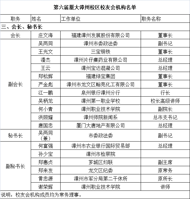 第六届厦大漳州校区校友会机构名单-会长、秘书长